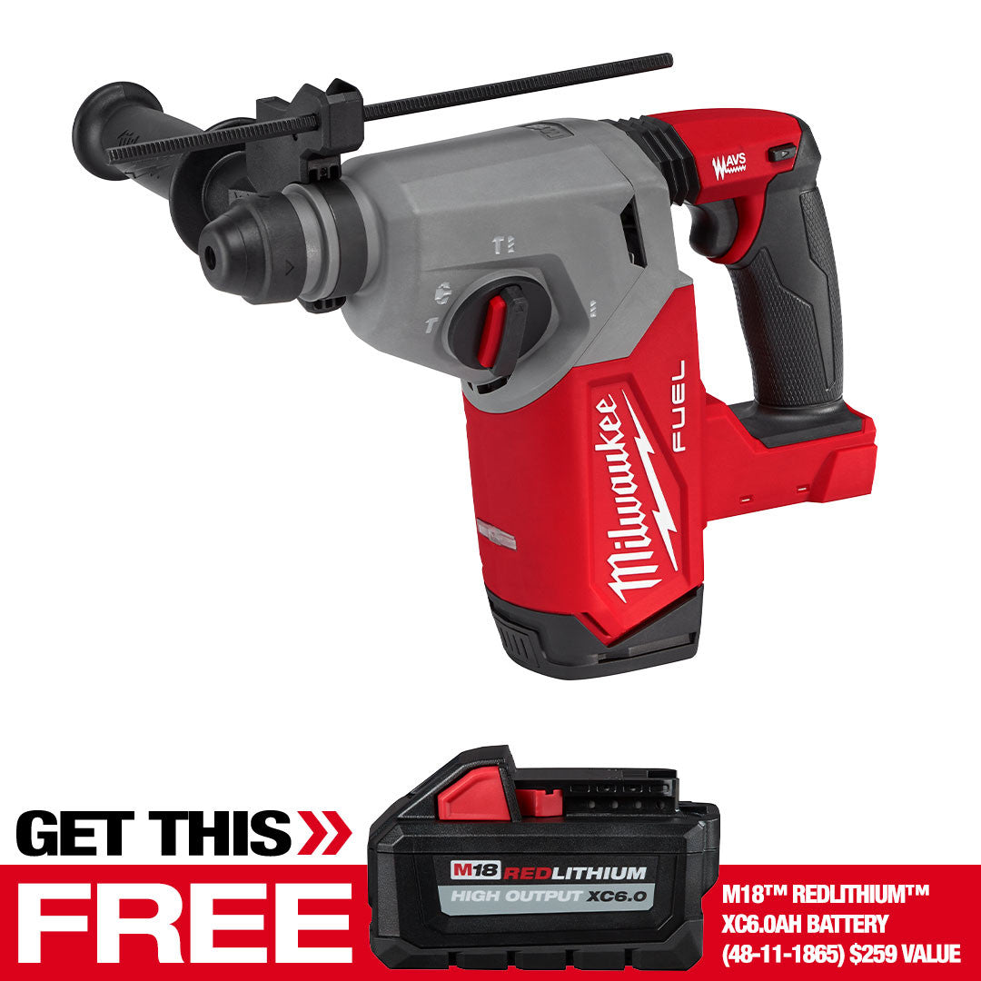 The M18 FUEL™ 1" SDS Plus Rotary Hammer is the next generation of cordless rotary hammers delivering ultimate jobsite performance and productivity. The MILWAUKEE® M18 FUEL™ 1" SDS Plus Rotary Hammer is the fastest drilling rotary hammer in its class, includes AUTOSTOP™ Control for enhanced safety, and can drill up to (125) 3/8 in. x 2 in. holes per charge when paired with the M18™ REDLITHIUM™ HIGH OUTPUT™ XC6.0 Battery. The POWERSTATE™ Brushless Motor delivers you 2 ft-lbs of impact energy, 1,330 RPM, and 4,800 BPM, providing speed and power in the most demanding applications. REDLINK PLUS™ intelligence tool technology ensures maximum rotary drill performance and protects it from overload, overheating, and over-discharge. The M18™ REDLITHIUM™ HIGH OUTPUT™ XC6.0 Battery delivers 50% more power while running 50% cooler than the M18™ REDLITHIUM™ XC batteries. This hammer provides maximum control and enhanced safety with the AUTOSTOP™ Kickback Control. This feature prevents over-rotation if the tool gets bound up while you're drilling in rebar or hard aggregate. Our AVS Anti-Vibration System minimizes vibration for maximum comfort.